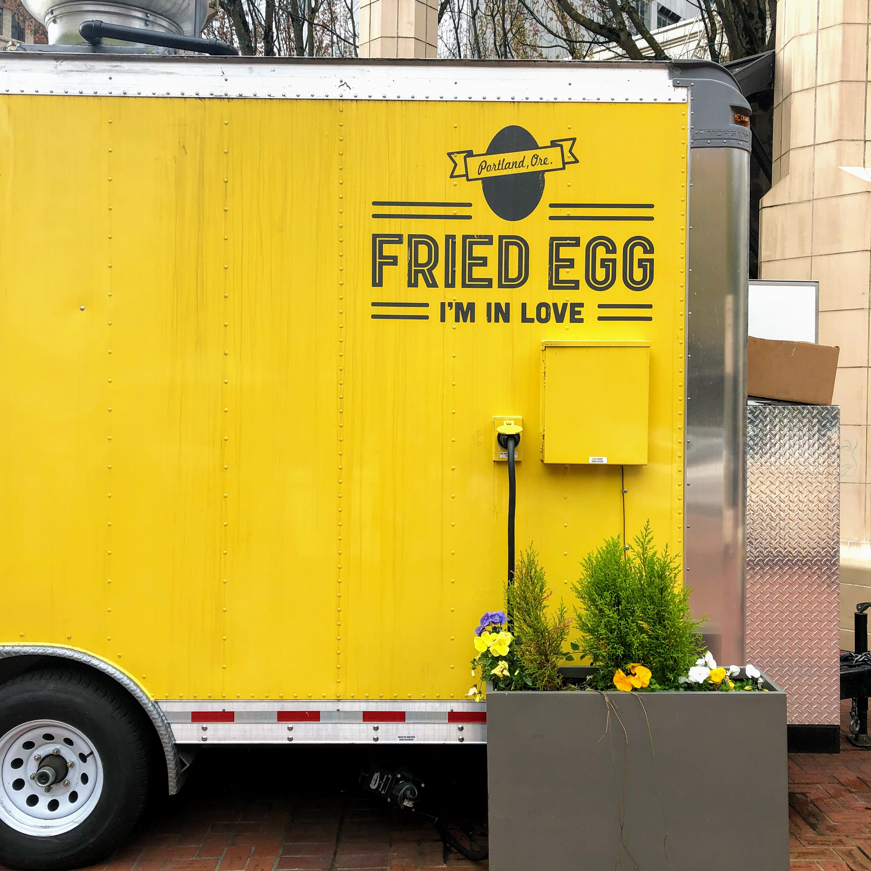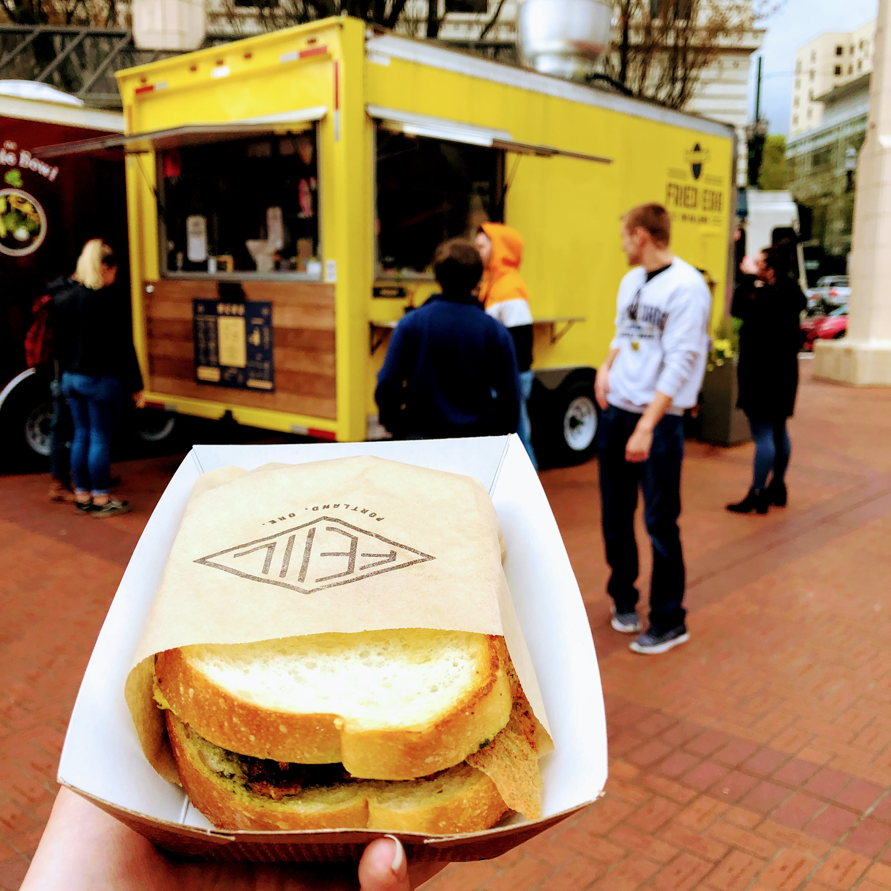 I kicked off my Portland weekend with a food truck in the heart of downtown. This adorable, bright yellow truck makes the perfect assortment of breakfast sandwiches to pep up your day. The punny menu names are matched only by their perfectly soft fried eggs. So yolky, so delicious…
